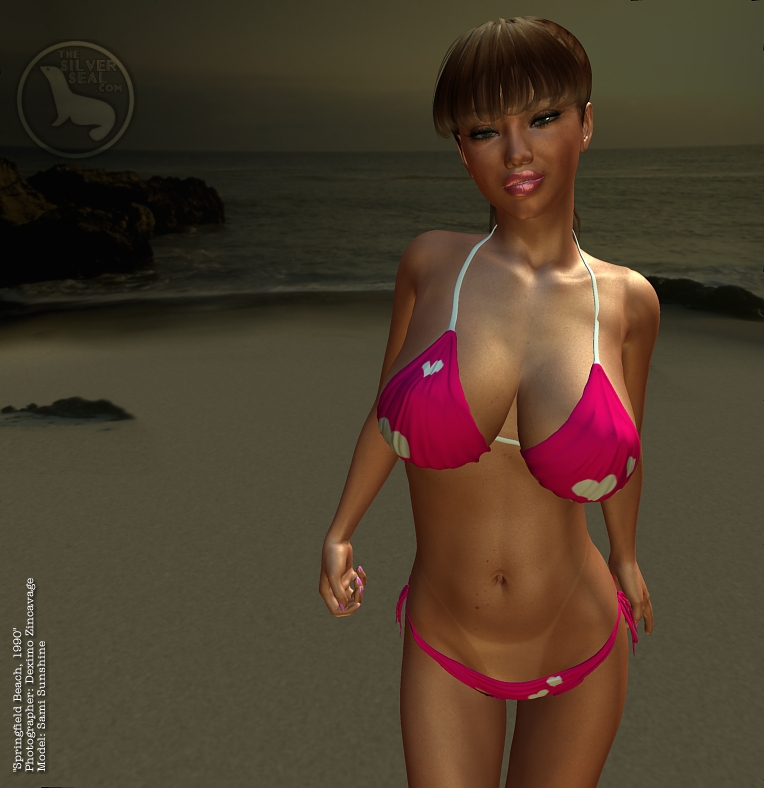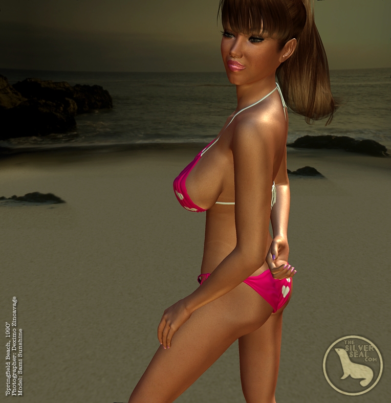 It's Sami Sunshine looking as dazzling as the Springfield Beach Sunrise in this adorable bikini from our Swimwear department! She looks great and you will, too, once you slip yourself into it and make your way to your favorite surf-spot! (Okay, let's be honest. You probably don't have a body like Sami but does it really matter in the end? Men will still be looking at you in this thing. Seriously. Men are pigs. Maybe you don't want them looking at you, anyway. But they will. Honest!)