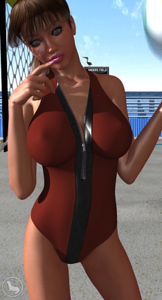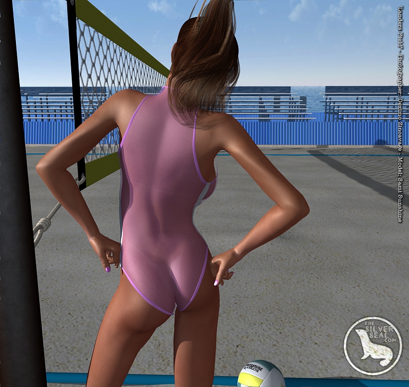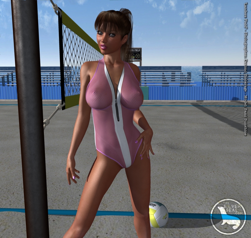 Sami's volleyball set is part of the Richabri's Beach Volleyball Set collection which you can get here. Many custom textures were created and used on the item. Some custom morphs were also used for this piece. Sami's hair is 50's Ponytail by MayaX which you can get at Renderosity. Sami's suit is Focus which you can get at Renderosity. Pink sheer custom textures were created and used on the item.